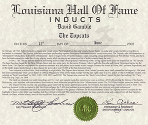 On June 12th, 2005, The Topcats were inducted into the Louisiana Hall of Fame! The induction ceremony took place at Boomtown Casino where The Topcats were the first of numerous acts to be inducted for 2005. The band started out by playing a power packed, forty minute, set to a packed house. The response was amazing! The guys brought the house down! After their set, Lou Gabus, the president and founder of the Louisiana Hall of Fame's Entertainment Division, presented David, Buzzy, Pat, and Rob each with personalized certificates of induction! The whole ceremony was extensively photographed and video taped, so if you were not able to attend the presentation, photos and video will be available in the future!